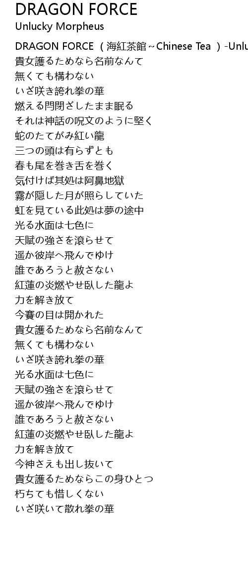 | [00:00.00] | DRAGON FORCE hǎi hóng chá guǎn Chinese Tea Unlucky Morpheus |