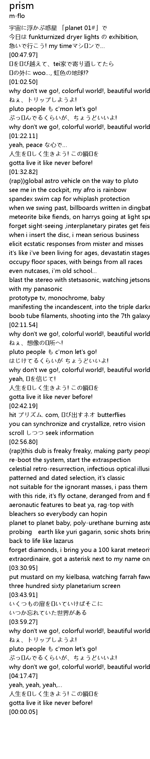 | [03:16.99] | planet to planet baby, polyurethane burning asteroids |