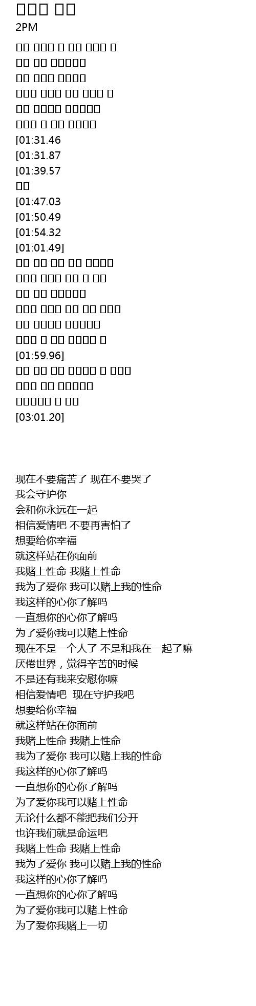 | [02:19.71][01:31.87][00:33.08] | 내 목숨을 건다 내 목숨을 건다 |