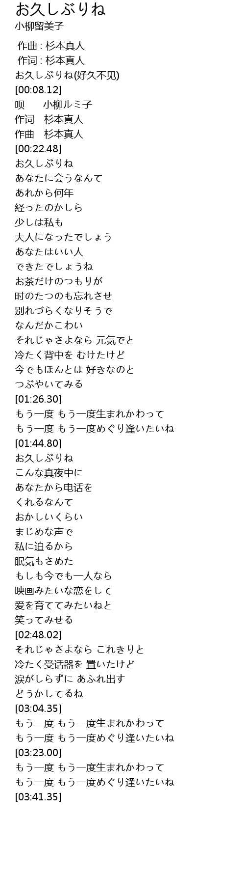 | [01:36.43] | もう一度 もう一度めぐり逢いたいね |