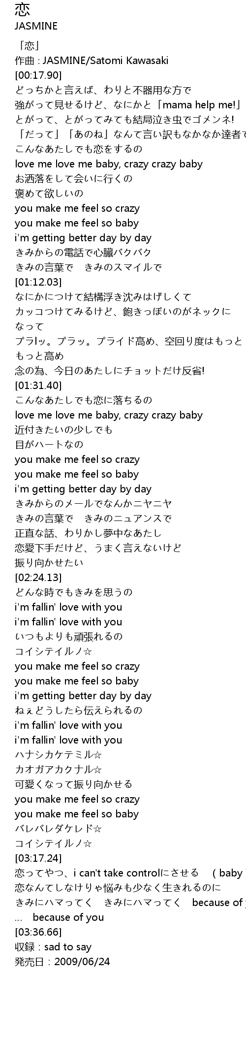 | [03:18.37] | 恋ってやつ、i can't take controlにさせる (baby) |