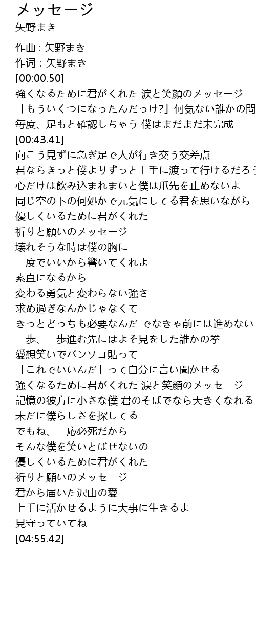 | [04:01.96] | 優しくいるために君がくれた 祈りと願いのメッセージ |