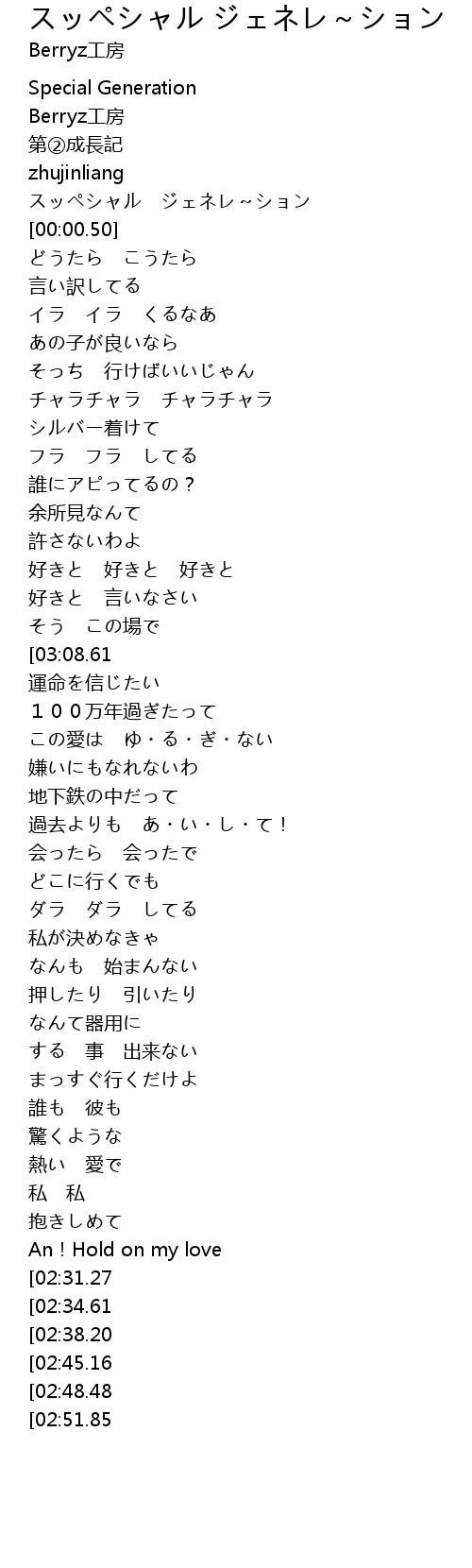 | [03:22.59][03:08.61][02:41.60][02:28.20][01:21.72][01:07.34] | スッペシャル ジェネレ~ションLOVE |
