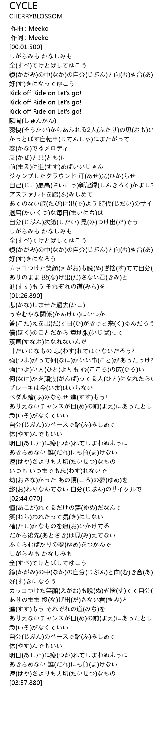 | [02:37.970] | 終(お)わりなんてない 自分(じぶん)のサイクルで |