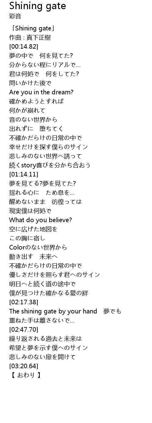 | [02:30.40] | The shining gate by your hand 夢でも |