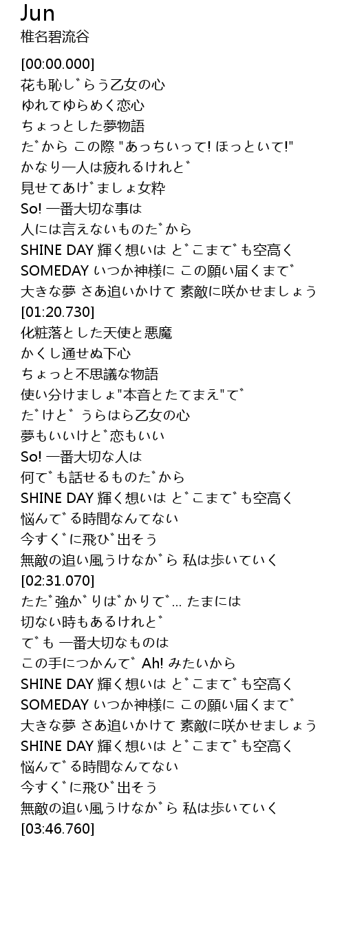 | [03:23.650] | SHINE DAY 輝く想いは どこまでも空高く |