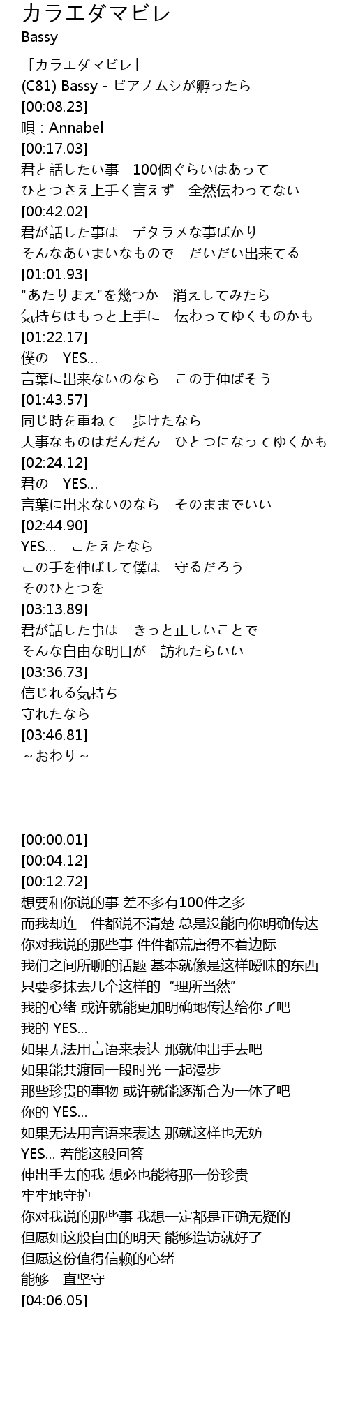 | [00:04.12] | (C81) Bassy - ピアノムシが孵ったら |