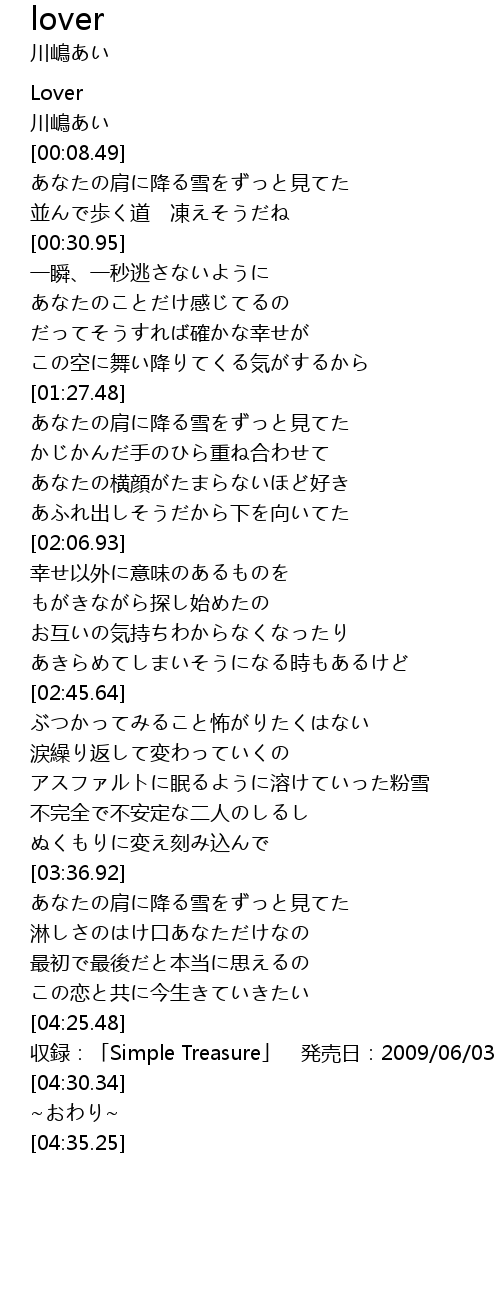 | [04:27.86] | 収録:「Simple Treasure」 発売日:2009/06/03 |