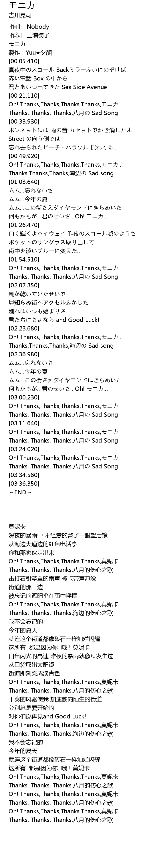 | [03:00.600] | Oh! Thanks,Thanks,Thanks,Thanks,莫妮卡 |