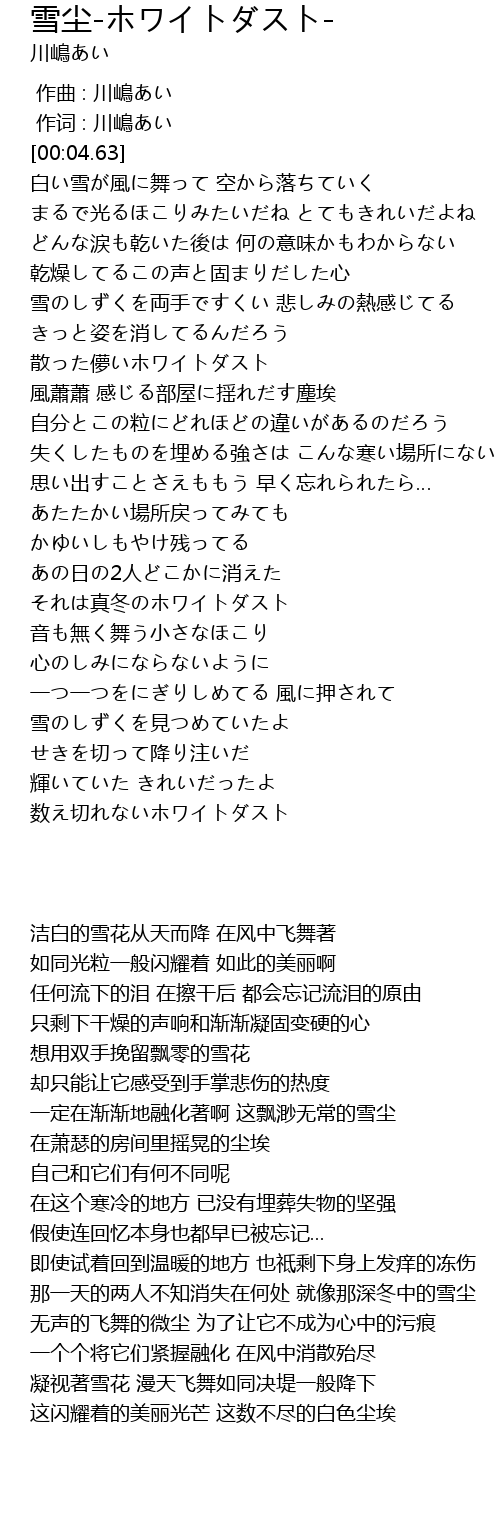 | [02:52.73] | あの日の2人どこかに消えた それは真冬のホワイトダスト |