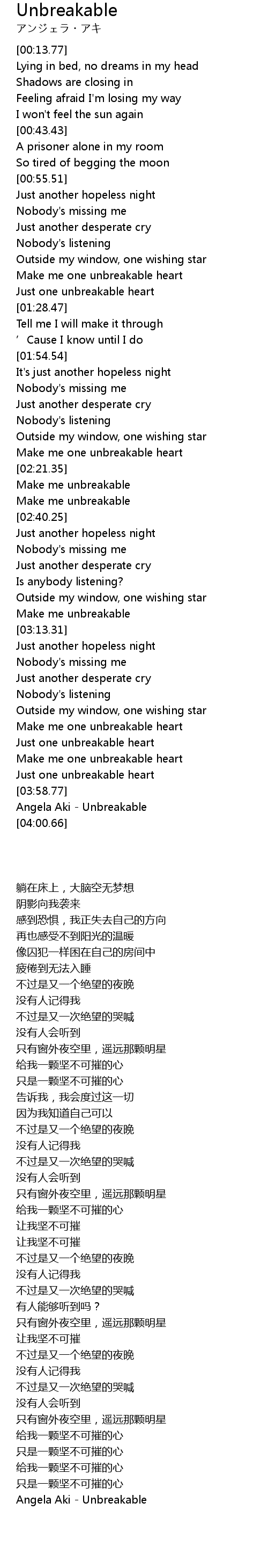 | [03:59.50] | Angela Aki Unbreakable |
