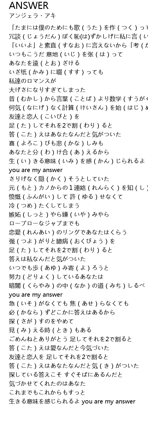 | [01:35.68] | 生(い)きる意味(いみ)を感(かん)じられるよ you are my answer |