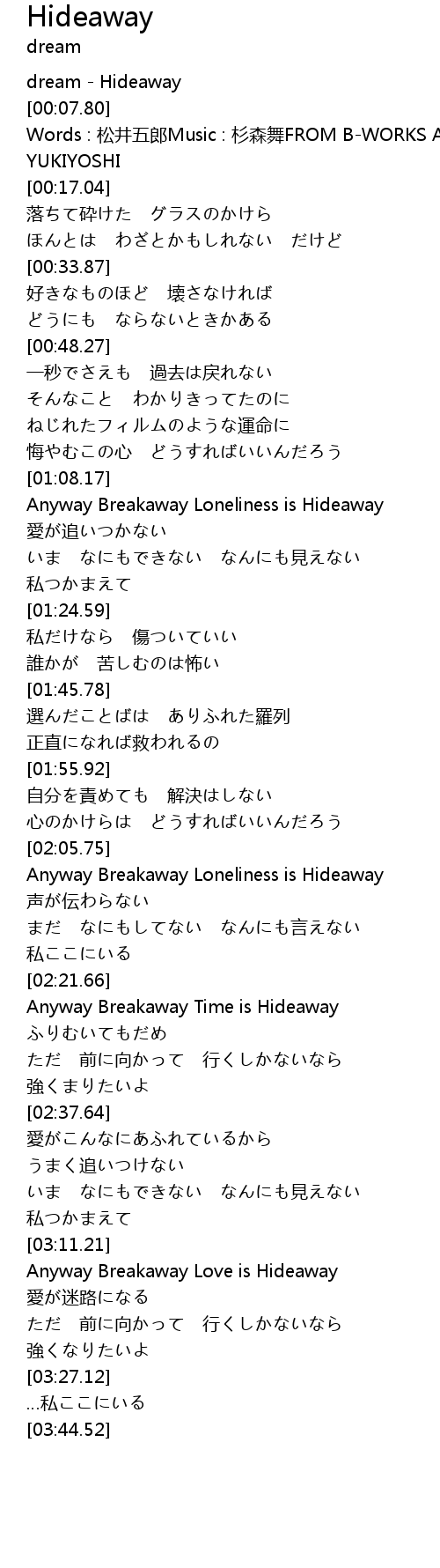 | [02:22.08] | Anyway Breakaway Time is Hideaway |