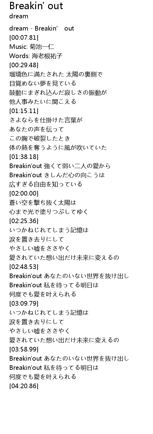 | [03:59.68] | Breakin'out あなたのいない世界を抜け出し |
