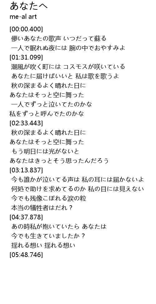 | [02:00.883] | あなたに届けばいいと 私は歌を歌うよ |
