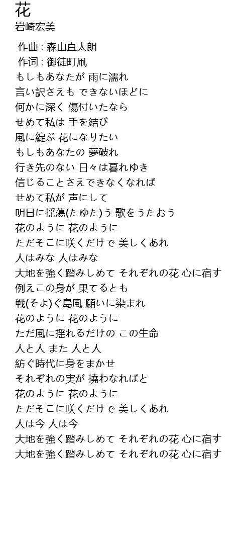 | [03:48.78] | 大地を強く踏みしめて それぞれの花 心に宿す |
