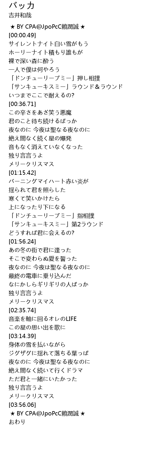 | [03:27.65] | 夜なのに 今夜は聖なる夜なのに |