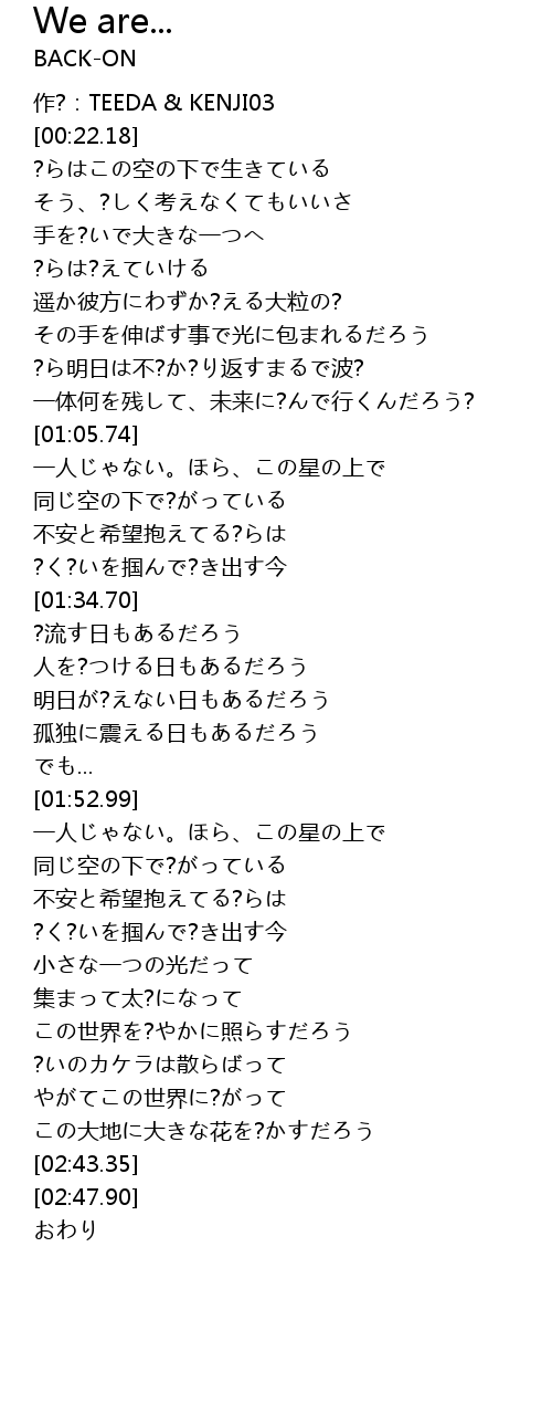| [01:09.00] | 一人じゃない。ほら、この星の上で |