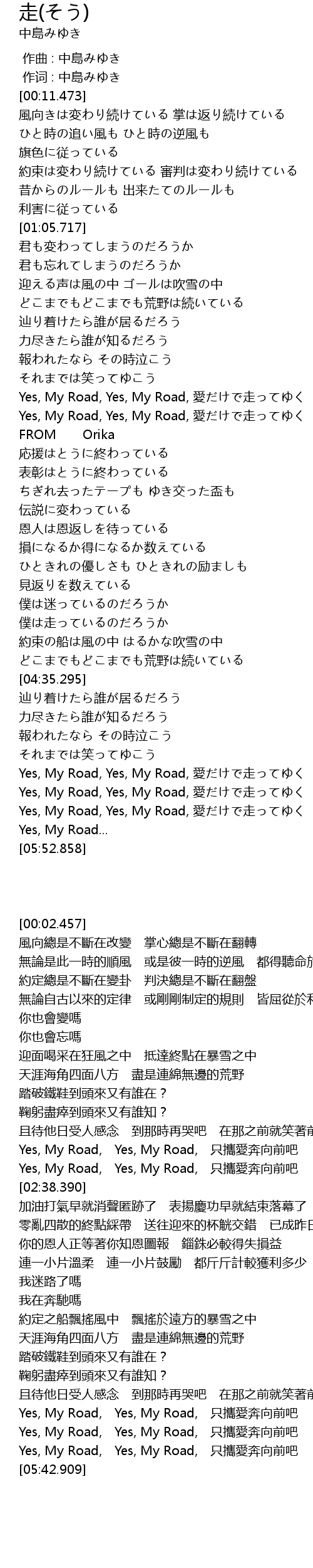 | [05:03.019] | Yes, My Road, Yes, My Road, 只攜愛奔向前吧 |