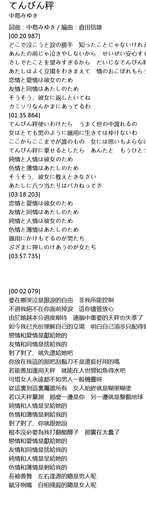 | [02:06.023] | てんびん秤使いわけたら うまく世の中渡れるの |