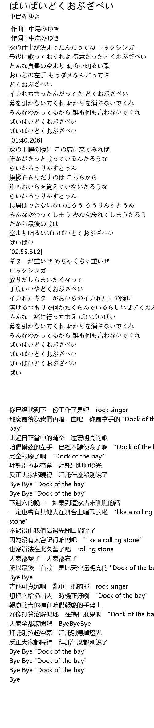 | [04:35.978] | Bye Bye "Dock of the bay" |