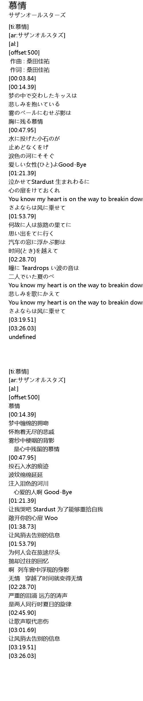 | [00:01.00] | 作词 : 桑田佳祐 |