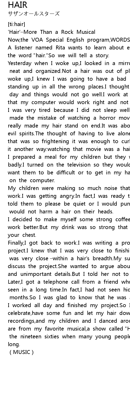 | [00:20.181] | A listener named Rita wants to learn about expressions with the word " hair." So we will tell a story. |