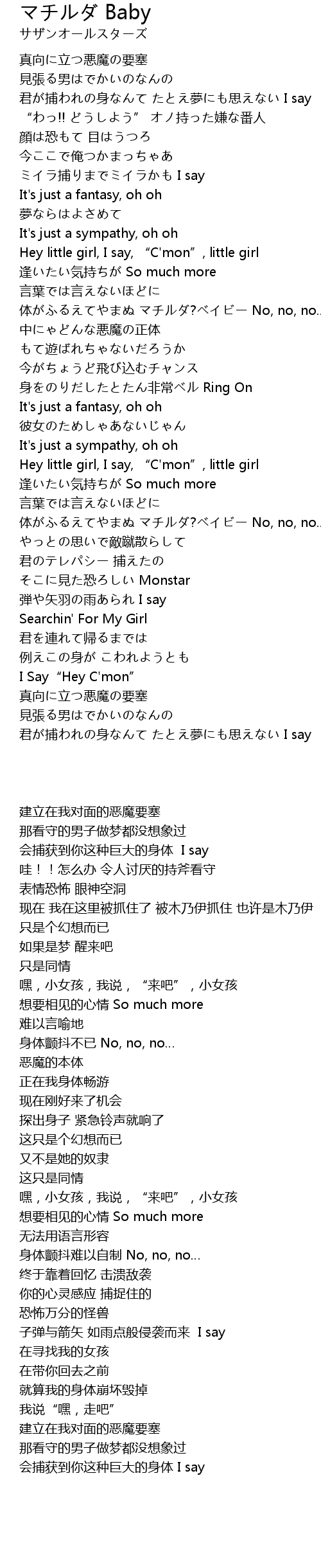 | [02:42.930] | 体がふるえてやまぬ マチルダ?ベイビー No, no, no… |