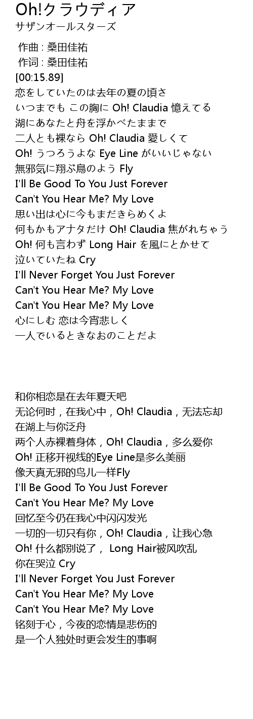 | [00:31.41] | いつまでも この胸に Oh! Claudia 憶えてる |