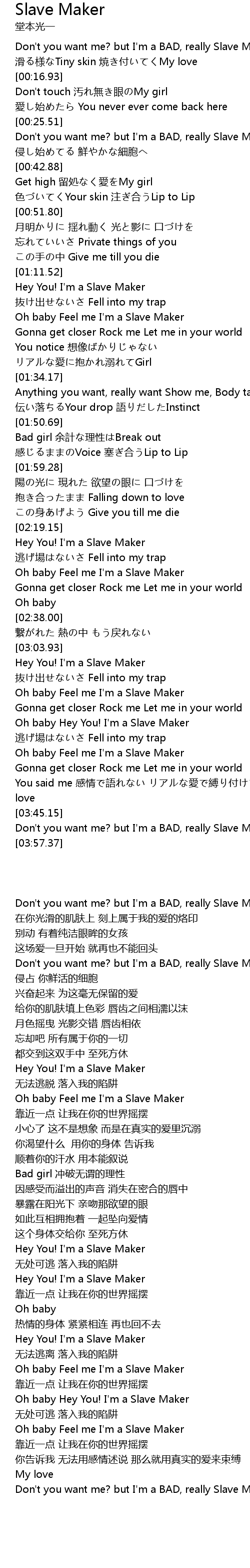 | [03:30.69] | Oh baby Feel me I'm a Slave Maker |