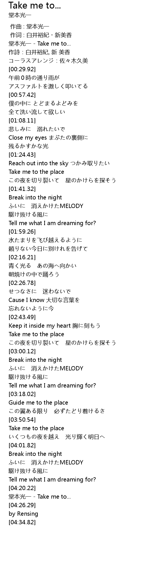 | [00:04.93] | táng běn guāng yī Take me to... |