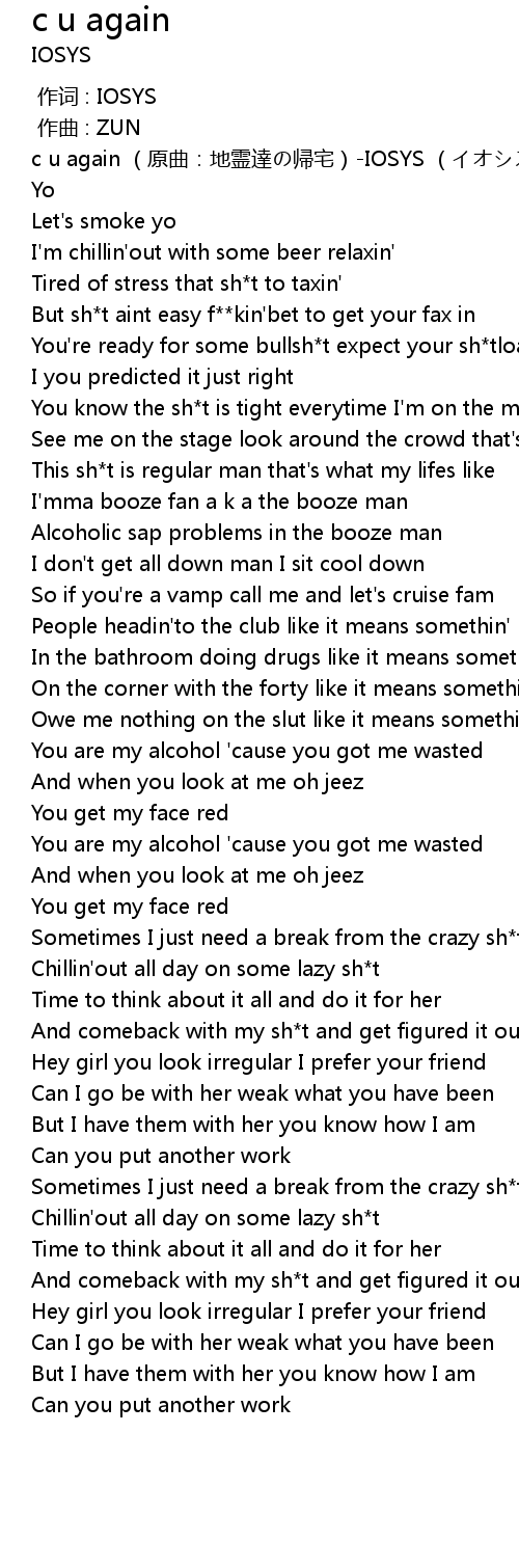 | [00:00.275] | c u again (原曲:地霊達の帰宅)-IOSYS (イオシス) |