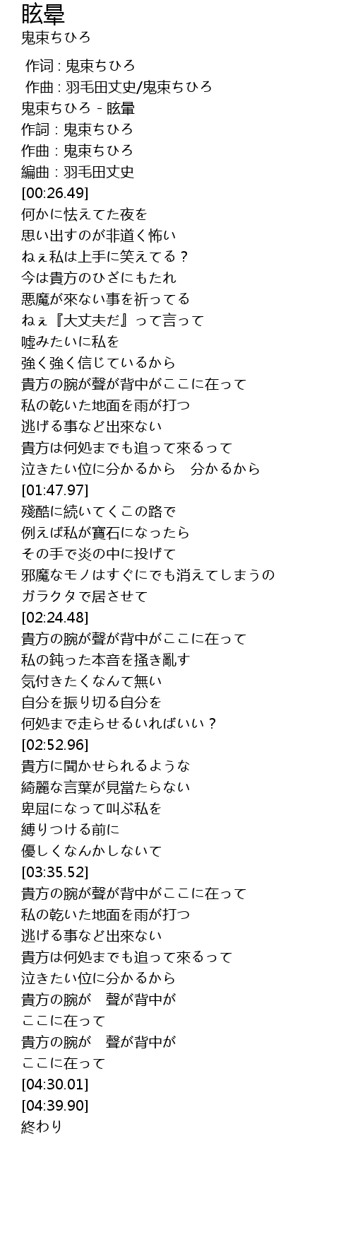 | [00:00.000] | 鬼束ちひろ - 眩暈 |