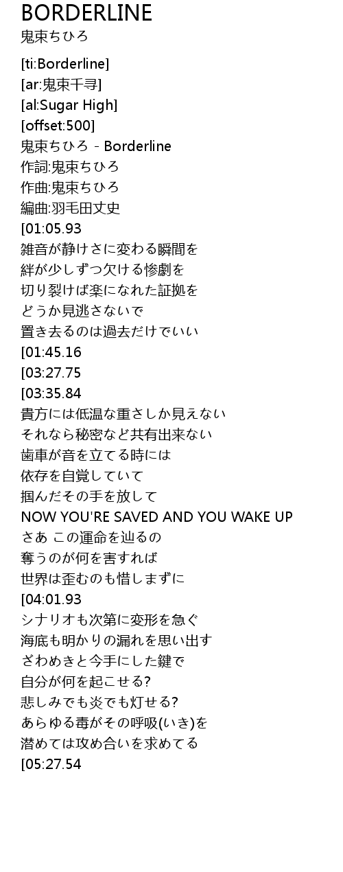 | [02:25.01][04:01.93] | BORDERLINE, BORDERLINE |