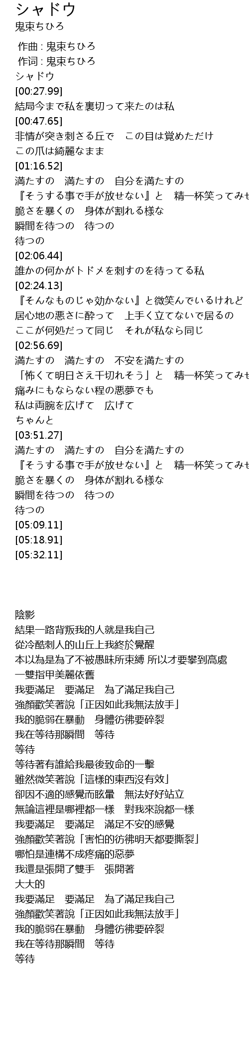 | [00:01.00] | 作词 : 鬼束ちひろ |