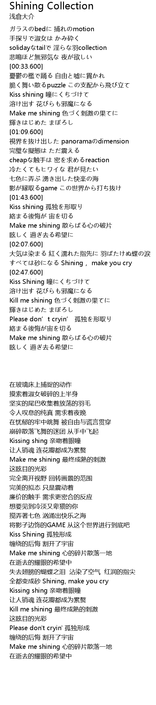 | [01:55.600] | Make me shining 心的碎片散落一地 |