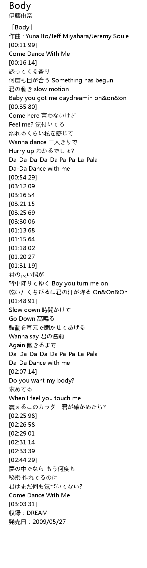 | [03:30.62][03:12.09][00:55.14] | Do you want my body? |