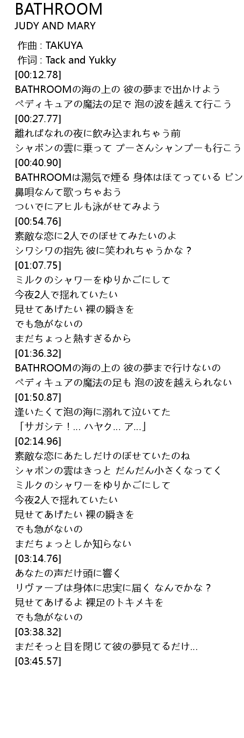 | [00:41.25] | BATHROOMは湯気で煙る 身体はほてっている ピンク色 |