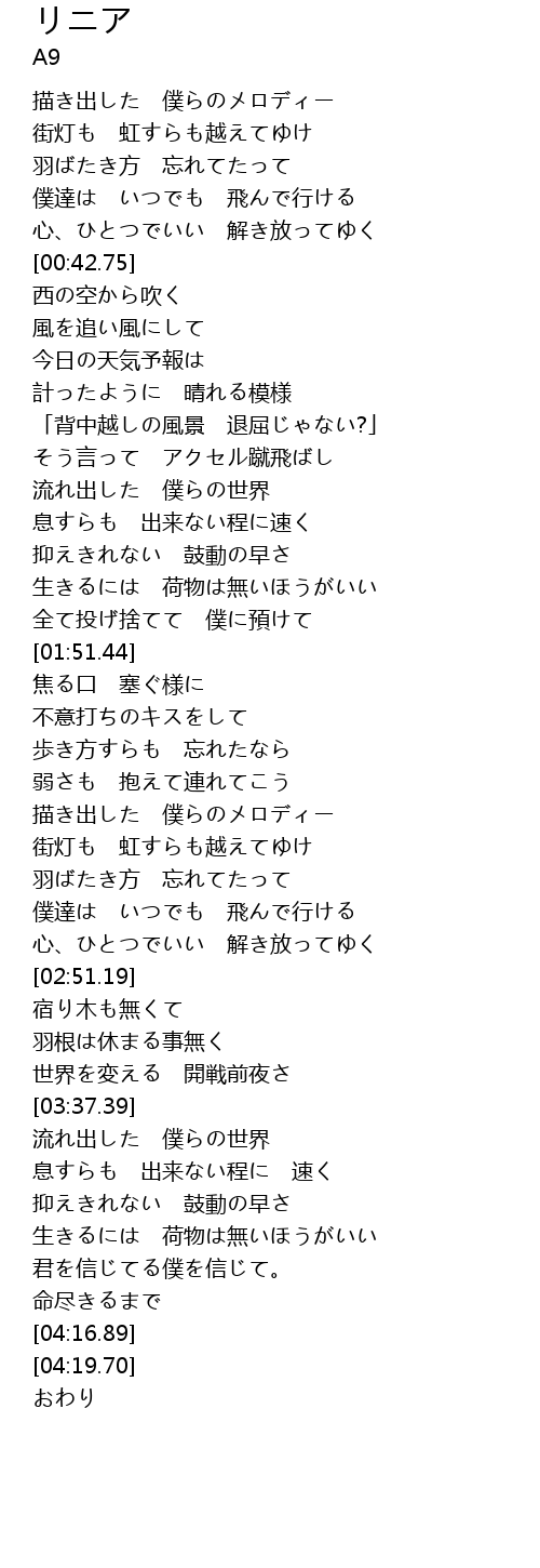 | [03:39.76] | 流れ出した 僕らの世界 |