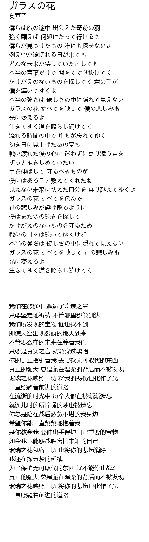 | [03:50.960] | ガラスの花 すべてを映して 君の悲しみも 光に変えるよ |