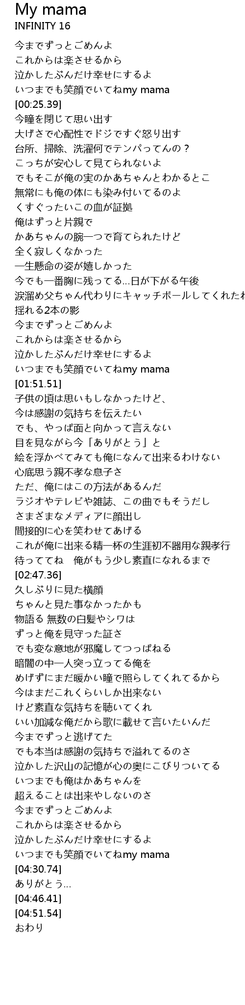 | [01:46.58] | いつまでも笑顔でいてねmy mama |