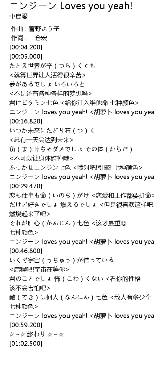 | [00:45.020] | ニンジーン loves you yeah! <胡萝卜 loves you yeah!> |