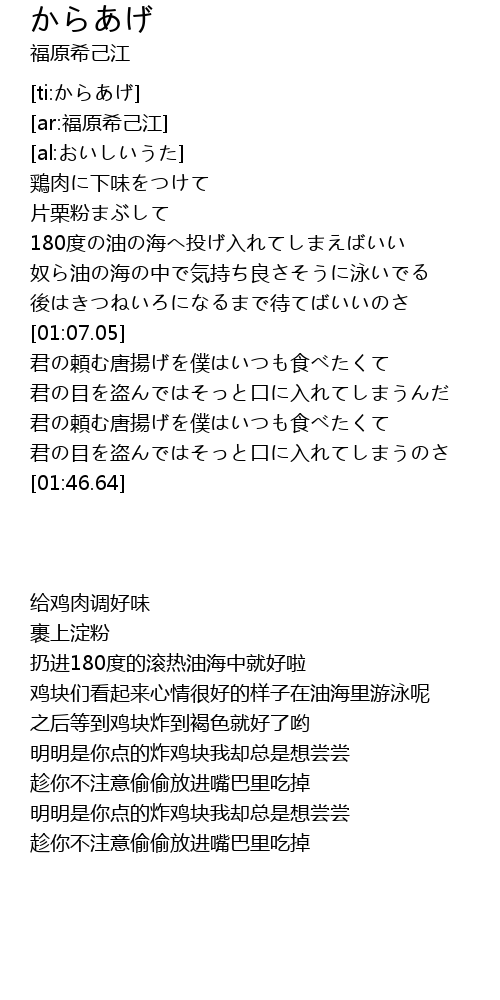 | [01:13.49] | 君の頼む唐揚げを僕はいつも食べたくて |