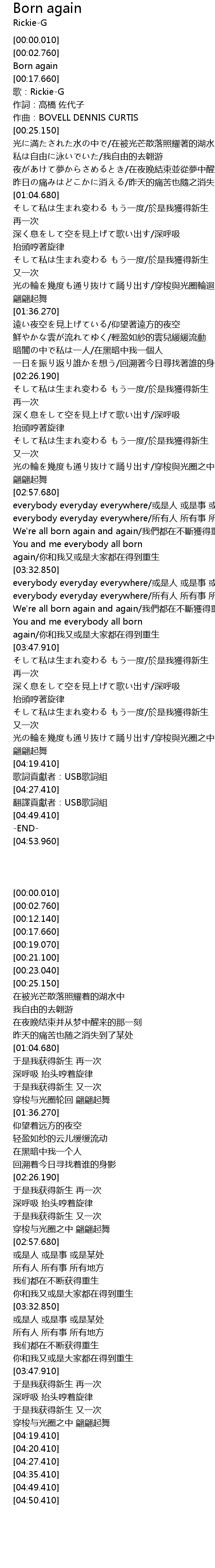 | [04:03.810] | そして私は生まれ変わる もう一度/於是我獲得新生 又一次 |