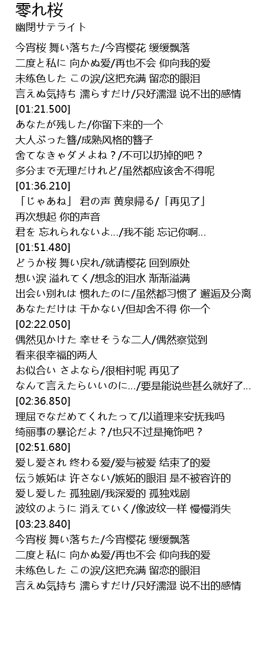 | [03:57.250] | 今宵桜 舞い落ちた/今宵樱花 缓缓飘落 |