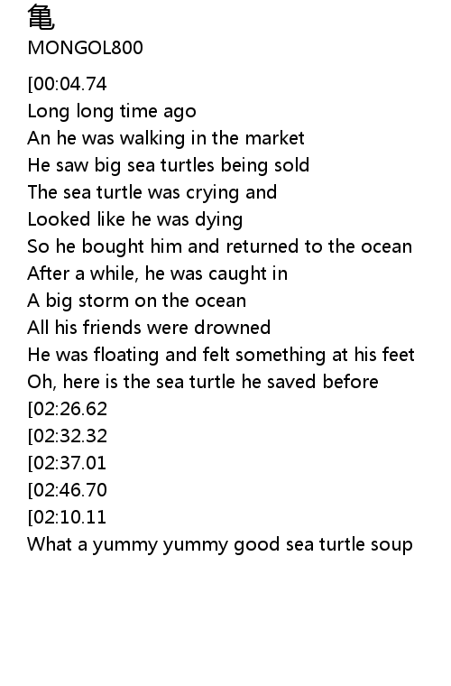 | [02:05.72][02:10.11] | Tonight' s dinner' s good sea turtle soup |