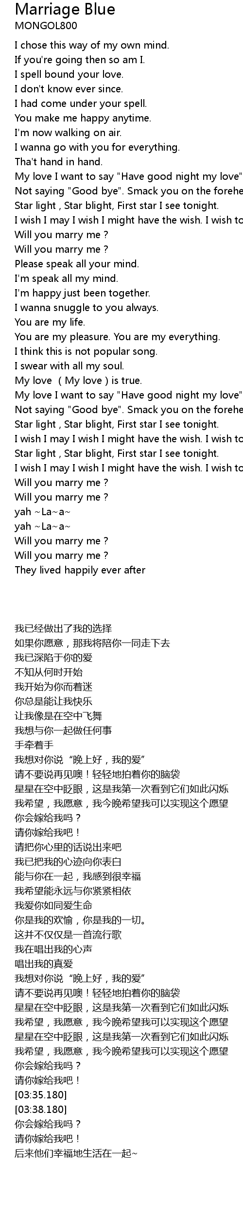 | [03:32.180] | Will you marry me ? |