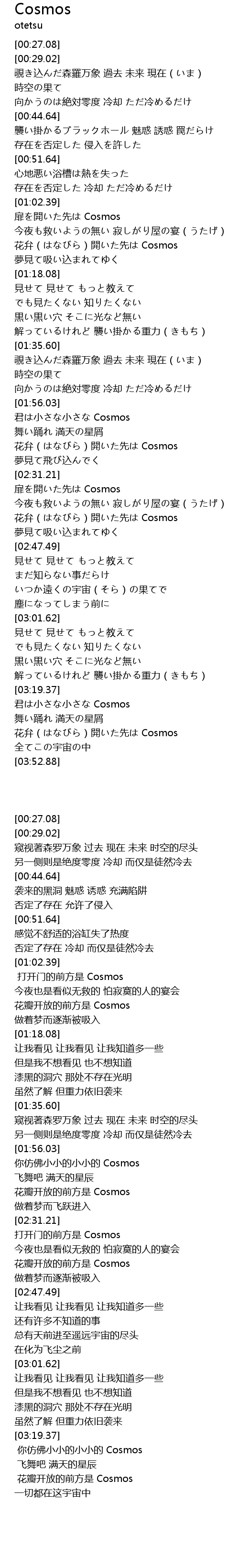 | [03:39.70] | 花弁(はなびら)開いた先は Cosmos |