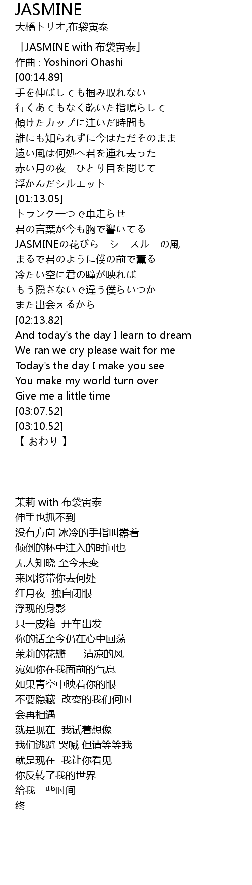 | [01:34.14] | JASMINEの花びら シースルーの風 |