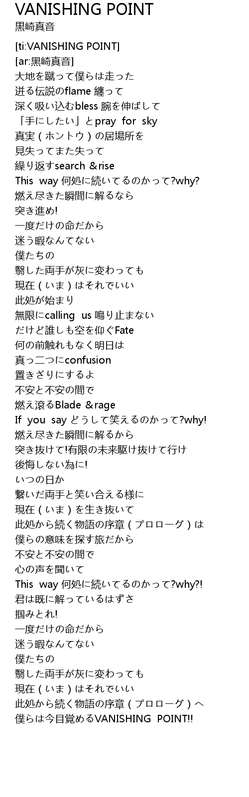 | [03:54.31] | 僕らは今目覚めるVANISHING POINT!! |